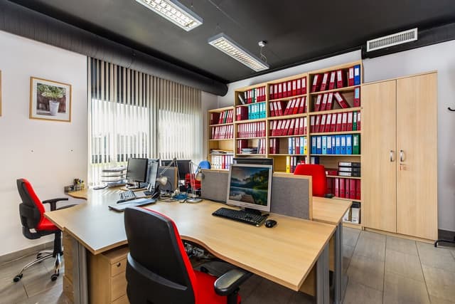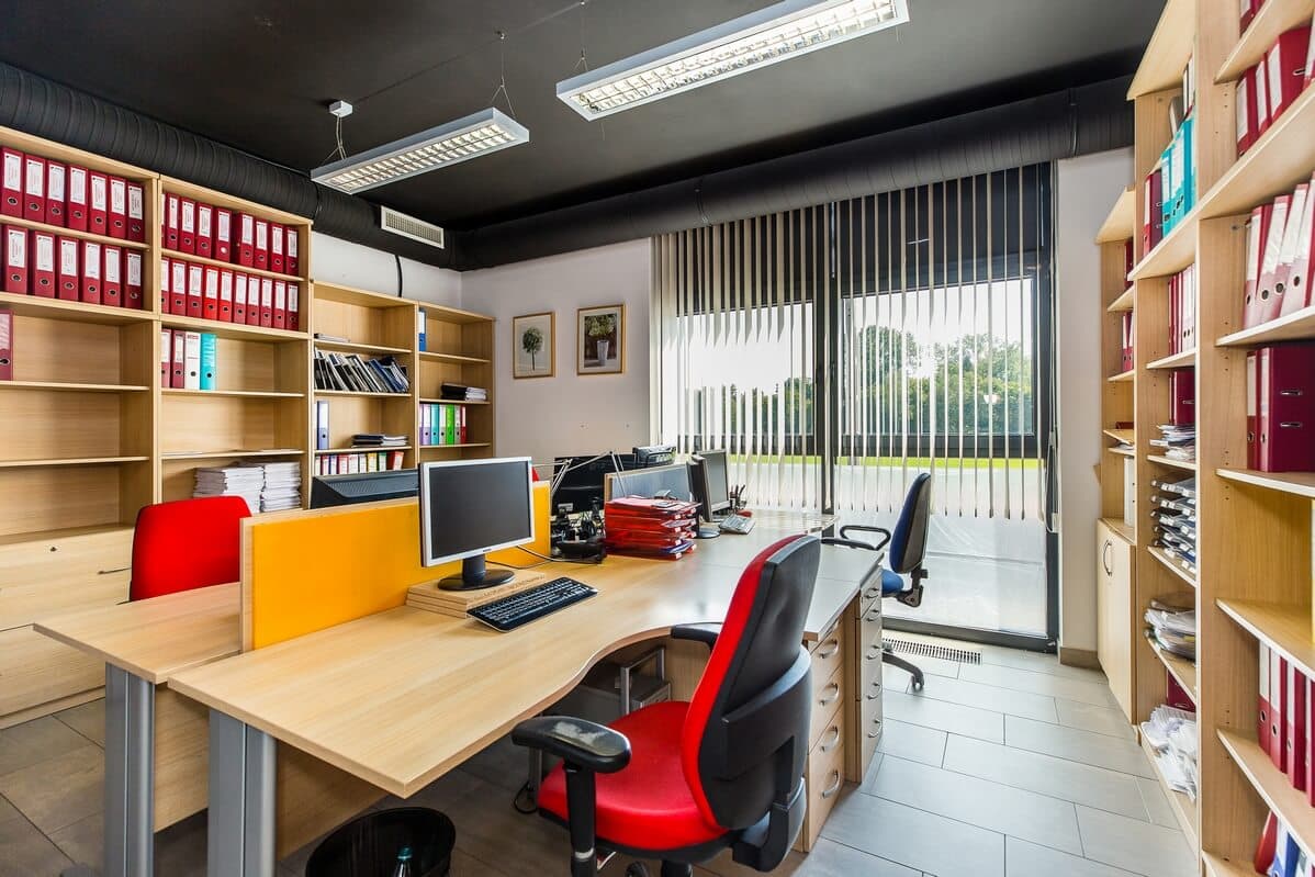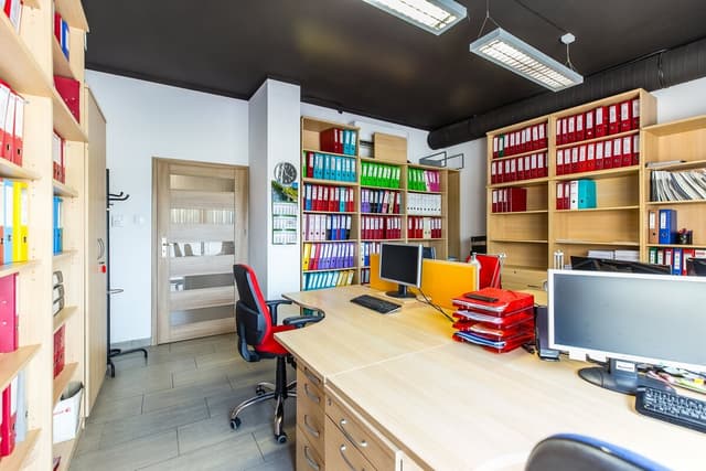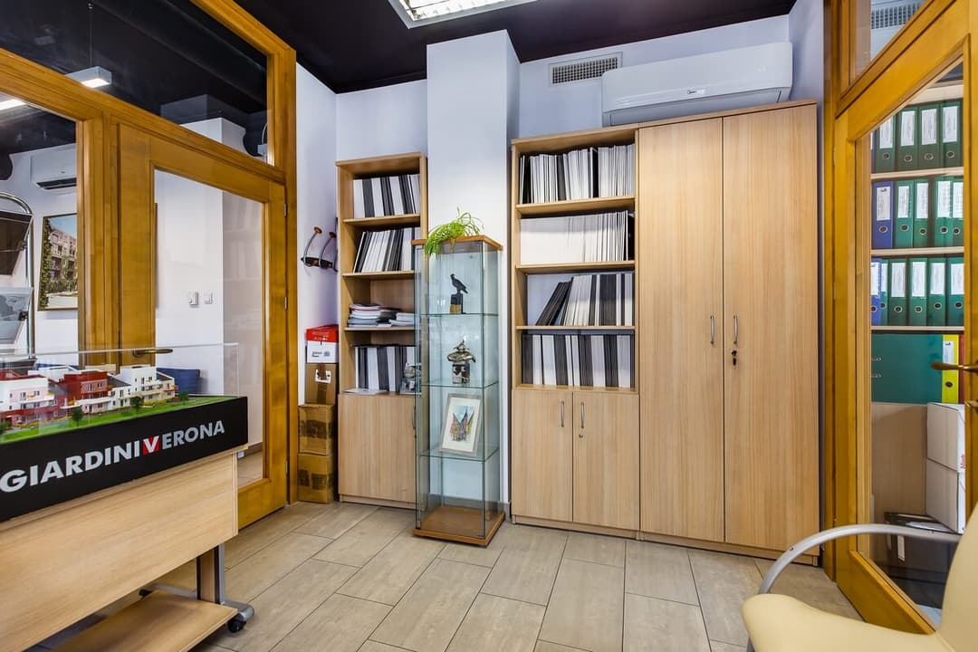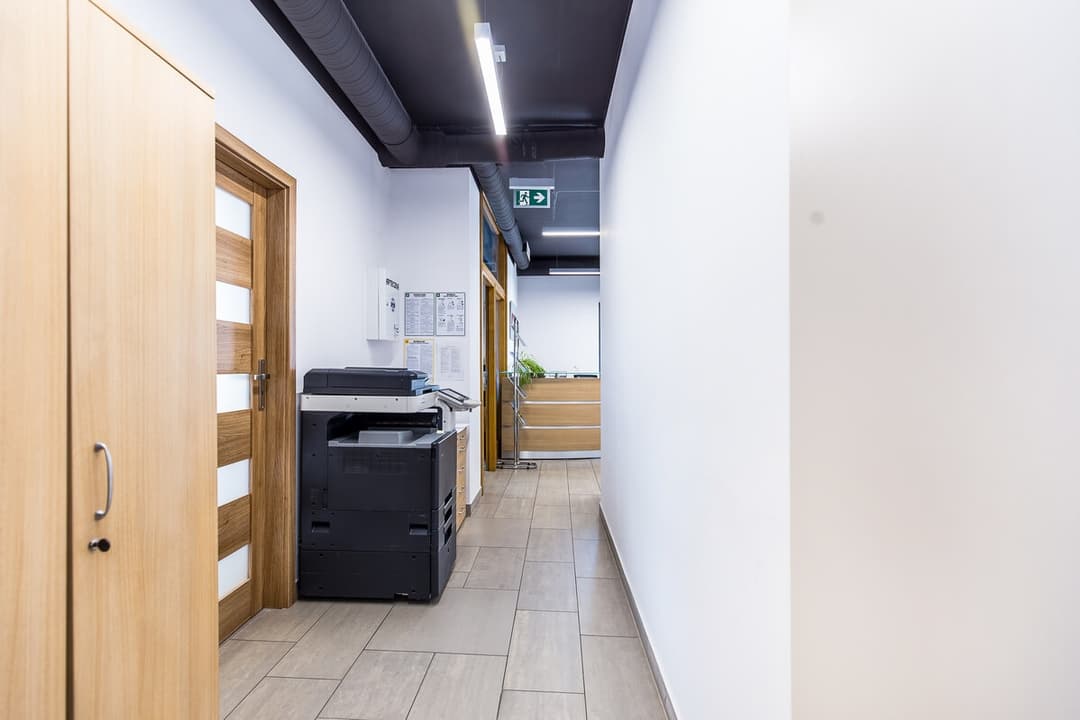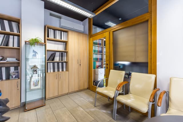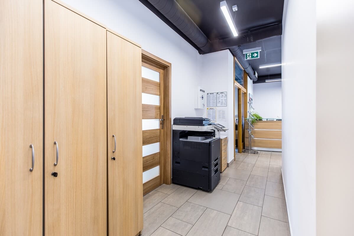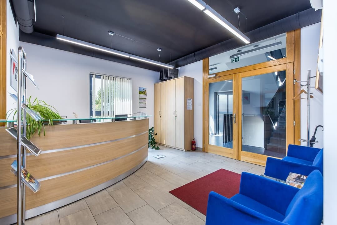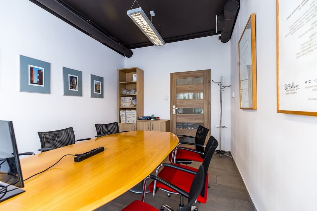 Sam lokal biurowy mieści się na pierwszym piętrze dwupiętrowego budynku. Przestrzeń obejmuje hol z recepcją, dwa gabinety (przystosowane do pracy dla kilku osób), salę konferencyjną, aneks kuchenny, WC oraz pomieszczenie gospodarcze. Wnętrza są umeblowane, wyposażone w klimatyzację i wentylację mechaniczną, a na podłogach położono kafle. Ogrzewanie zapewnia własna kotłownia gazowa.