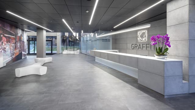 Do Graffit łatwo dojechać autobusami linii 174, 218, 165 oraz nocnymi N36 i N86. Budynek posiada certyfikat BREEAM na poziomie Excellent, co potwierdza zastosowanie rozwiązań przyjaznych środowisku i niższe koszty eksploatacji. Czynsz za wynajem biura wynosi 15,00 EUR/m², a opłata eksploatacyjna to 18,50 PLN/m².
