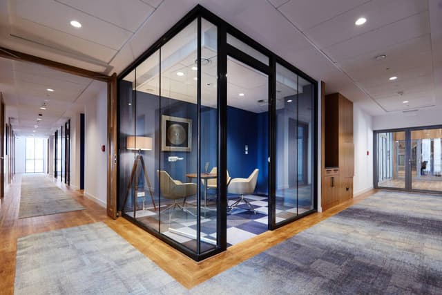 Budynek oferuje ok. 9 500 m² powierzchni, z czego 1 640 m² przeznaczono na usługi na parterze i pierwszym piętrze, a 4 071 m² to biura na wyższych kondygnacjach. W ofercie dostępne są różne moduły biurowe – od 3 m² do 610 m², z czynszem 24,50 EUR/m² oraz opłatą eksploatacyjną 33,48 PLN/m². Dzięki temu łatwo dopasować przestrzeń do potrzeb zarówno mniejszych firm, jak i większych zespołów.