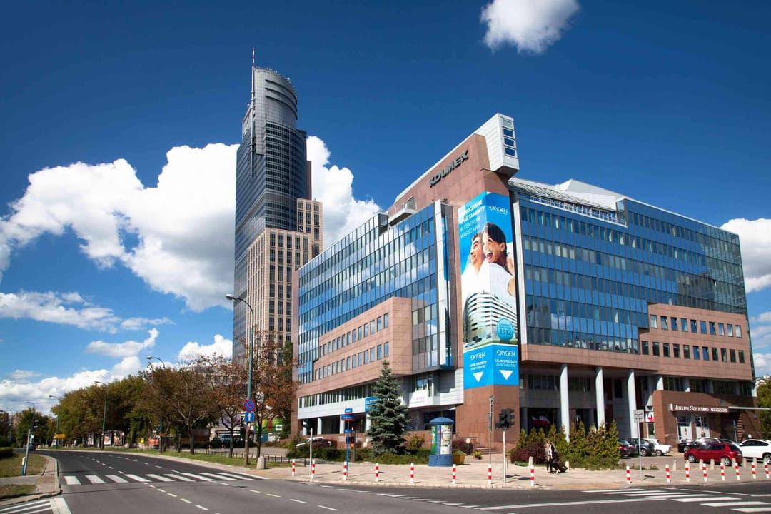Biurowiec Kolmex przy ul. Grzybowskiej 80/82 na Woli w Warszawie to miejsce, które od lat przyciąga uwagę swoim nietuzinkowym wyglądem i historią. Charakterystyczna bryła budynku, z elewacją pokrytą szkłem i marmurem, sprawia, że Kolmex wyróżnia się na tle innych biurowców w tej części miasta. Architekci zadbali o połączenie dynamicznych i minimalistycznych form, a efektowne wykończenie podkreślają naprzemiennie ułożone materiały, które tworzą spójną całość w odcieniach błękitu i czerwieni. Uskok bryły oraz głębokie podcięcie wejścia nadają budynkowi niepowtarzalny charakter, a solidne słupy podtrzymujące całość przywodzą na myśl przedwojenne kamienice narożne.